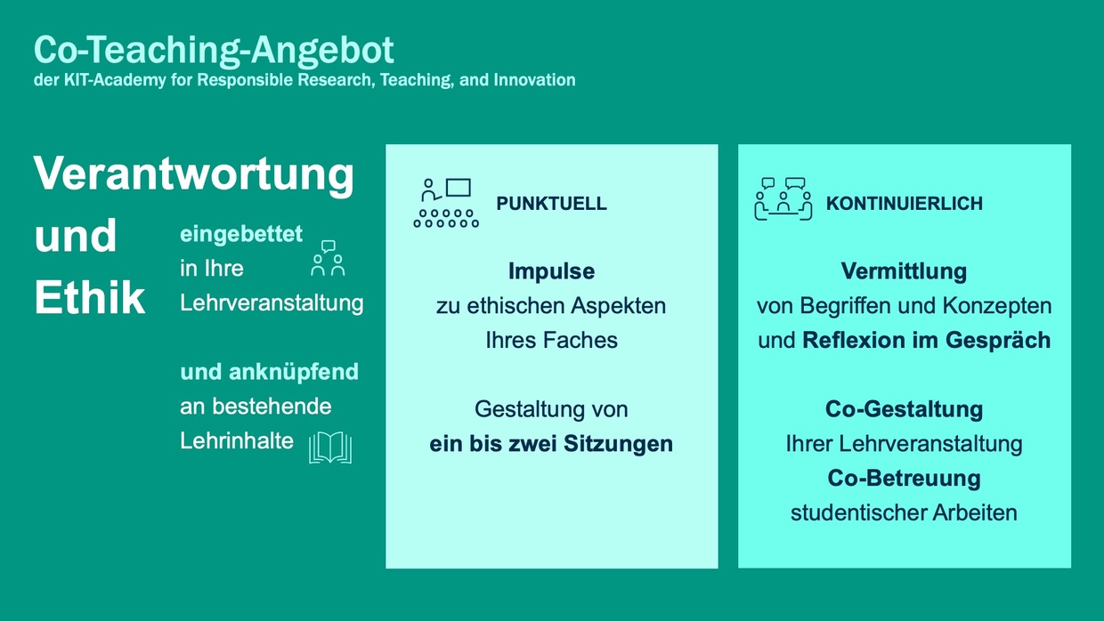 ARRTI bietet für bereits etablierte Lehrveranstaltungen anderer Fächer ein ethisch-philosophisches Co-Teaching an: Ausgehend von den Sachthemen der Lehrveranstaltung adressieren wir in Abstimmung mit dem Host fachspezifisch (verantwortungs-)ethische Fragestellungen in unterschiedlicher Tiefe. Dabei greifen wir je nach Kontext und Zielsetzung auf verschiedene, sich anbietende Formate zurück. Vorlesungen und Seminardiskussionen gehören dabei ebenso zum Repertoire wie Workshops oder das vertiefende Gespräche in Kleingruppen.